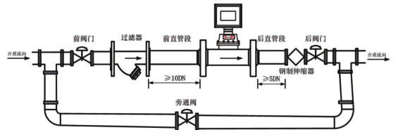 5、流量計應(yīng)水平安裝。建議在流量計后直管段后側(cè)安裝鋼制伸縮器(補償器),伸縮器必須符合管道設(shè)計的公稱通徑和公稱壓力的要求。伸縮器是作為管道應(yīng)力的補償及方便流量計的安裝與拆卸。