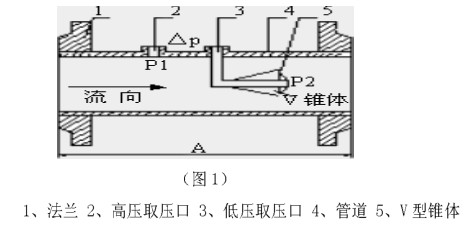 V錐流量計是一種差壓流量儀表,迄今為止以差壓原理設計的流量儀表已經有一百多年的應用歷史了。差壓原理是基于密封管道中的能量轉換原理,也就是說對穩定流體,流量與管道中介質流速的平方根成正比。圖一所示當介質接近錐體時,其壓力為P1,在介質通過錐體的截流區時,速度增大,壓力降低為P2,P1和P2都通過錐形流量計的取壓口引到差壓變送器上,當流速發生變化時,錐形流量計的兩個取壓口之間的差壓值會增大或縮小。