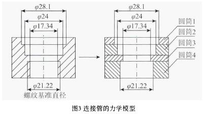 隨著內徑的變化,連接管實際上是由多個僅承受內壓的圓筒堆積而成,如圖3所示,自上而下,連接管可以近似看作是由內徑分別為¢18.1mm、¢24mm、¢17.34mm、¢21.22mm的4個圓筒粘接而成。