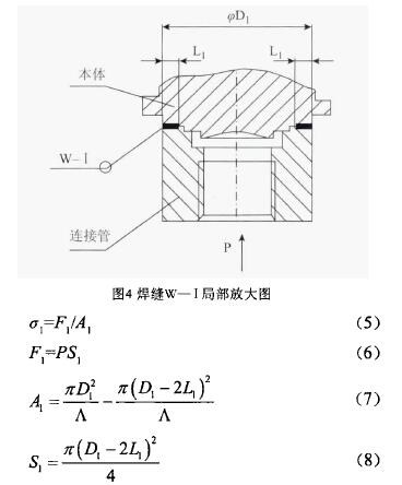 如圖4所示,P為設計壓強,設W-I焊縫的熔深為L1,焊接部外徑為¢D1,則其焊接部工作應力σ1,計算方法如下
