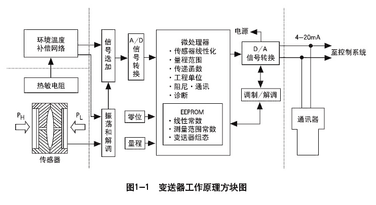 差壓變送器主要用于測(cè)量介質(zhì)的差壓、壓力、液位與密度,然后將其轉(zhuǎn)換成模擬信號(hào)輸出。差壓變送器由膜盒組件和智能轉(zhuǎn)換部件組成。其原理如下圖所示。