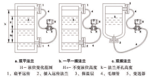 假設(shè)容器為敞口容器,差壓變送器的位置比最低液位低h距離,假設(shè)容器內(nèi)液體密度為ρ,容器內(nèi)液位高度為H,△P為變送器所受的壓力,則△P=ρg H+ρgh。