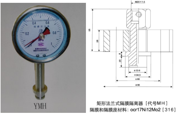 10、MH矩形法蘭式衛生型隔膜壓力表(均質機用):量程上限10~60MPa